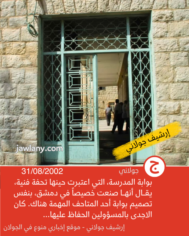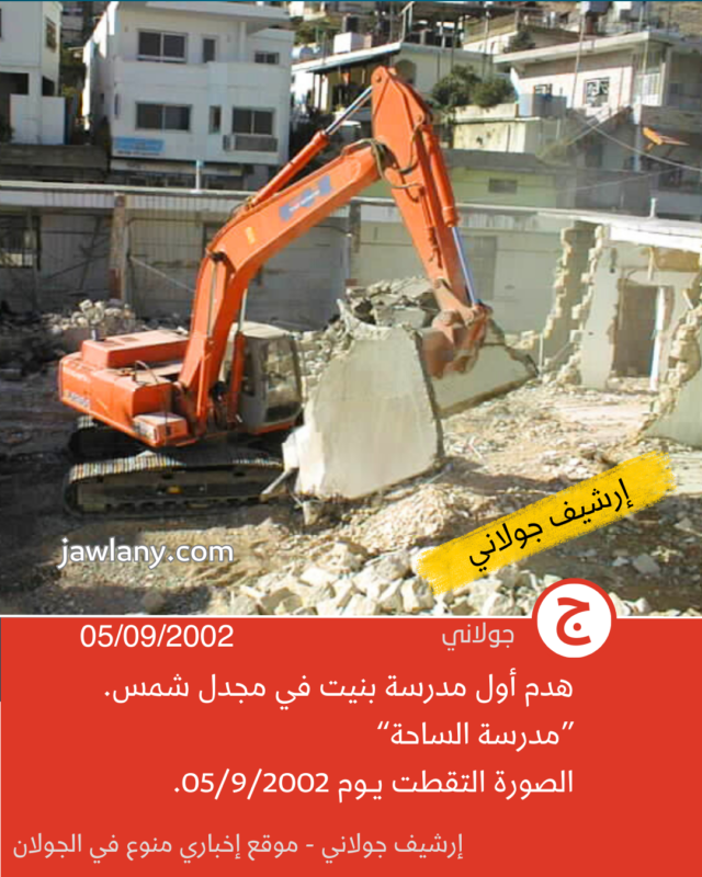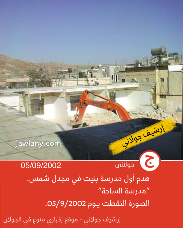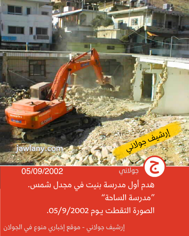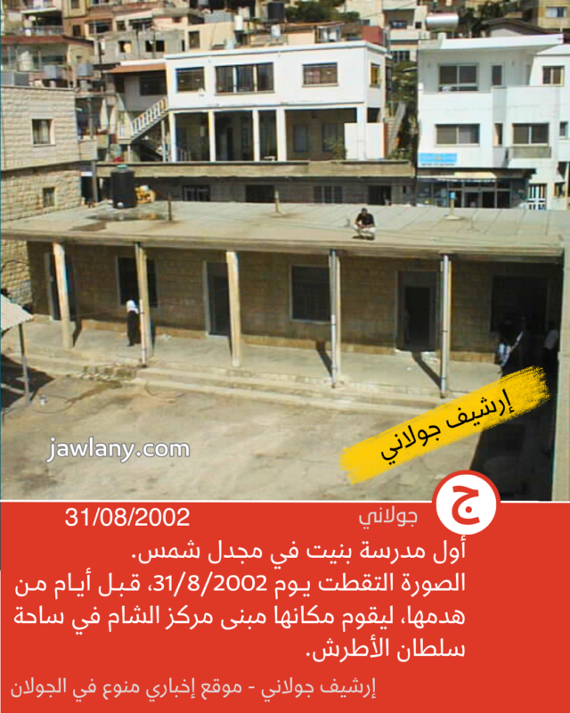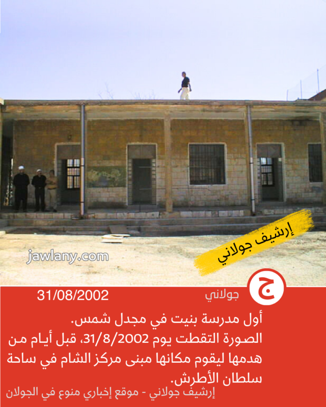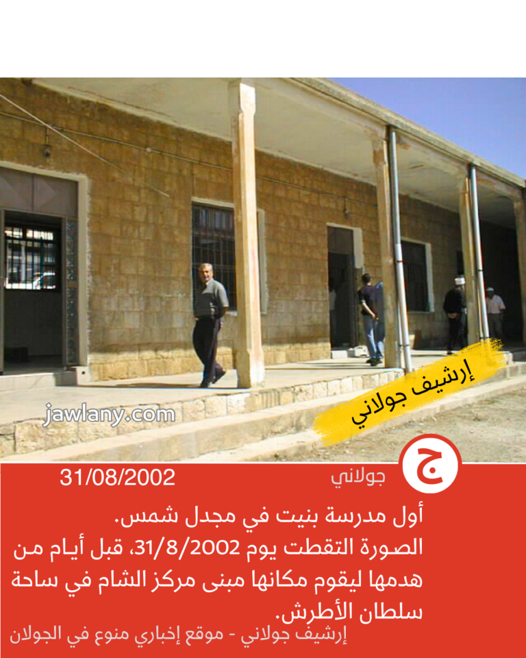 تموز 2002: صور من هدم مدرسة الساحة 06/12/2025 صور لأول مدرسة بنيت في مجدل شمس (ساحة سلطان الأطرش) وكانت تسمى في المراحل اللاحقة بـ “مدرسة الساحة” لتمييزها عن باقي المدارس. إعلان إعلان إعلان إعلان إعلان إعلان إعلان إعلان إعلان إعلانقسم من الصور التقطت قبل أيام من هدمها (31/8/2002)، وأخرى يوم هدمها بتاريخ 5/9/2002، لإقامة مبنى “مركز الشام” في مكانها: