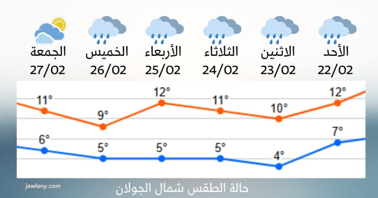تشهد منطقة شمال الجولان اعتباراً من صباح اليوم الأحد انخفاضاً ملموساً على درجات الحرارة، وسط أجواء ماطرة يُتوقع أن تستمر حتى نهاية الأسبوع، وفق المعطيات الجوية لمحطات الرصد الجوي.