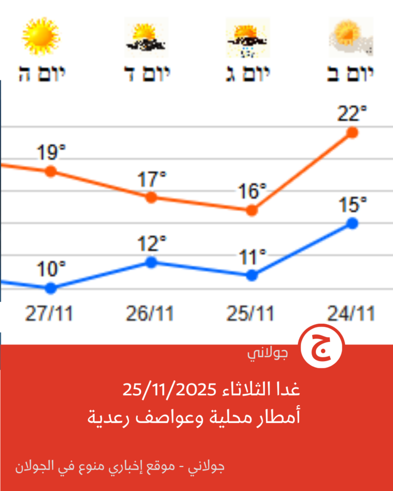 تشير محطات الرصد الحوي إلى أن الطقس، في منطقة شمال الجولان، سيكون يوم غد ماطراً، حيث تتدنى درجات الحرارة بصورة حادة إلى 11 درجة ليلاً و 16 درجة نهاراً، وتهب عواصف رعدية.