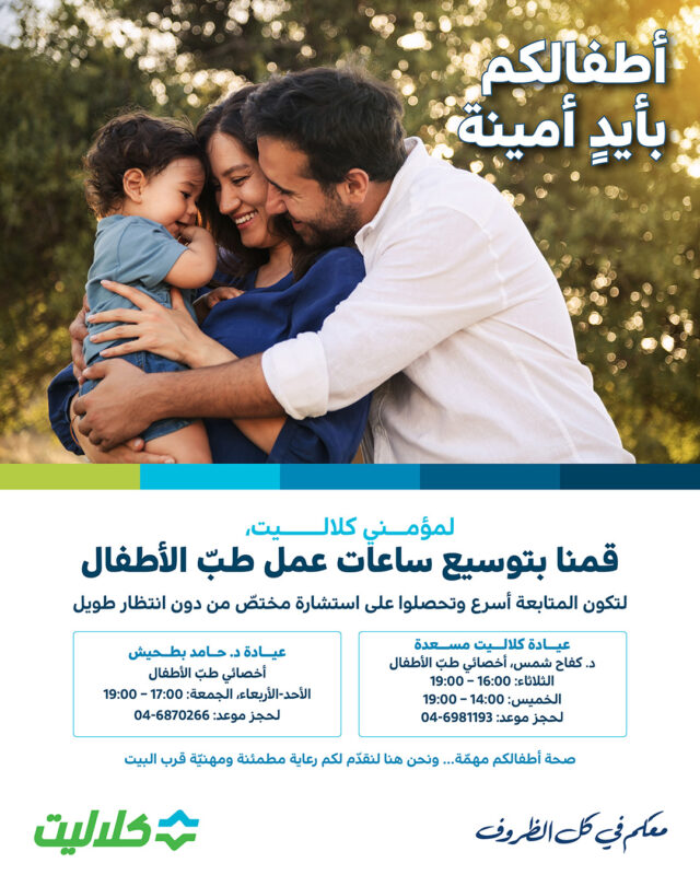 في خطوة تهدف إلى تعزيز جودة الخدمات وسهولة الوصول إليها، أعلنت عيادة “كلاليت” في مسعدة عن توسيع ساعات عمل عيادات طب الأطفال. يأتي هذا التحديث استجابةً لحاجة الأهالي المتزايدة للحصول على عناية طبية متخصصة لأطفالهم دون الحاجة لانتظار طويل.