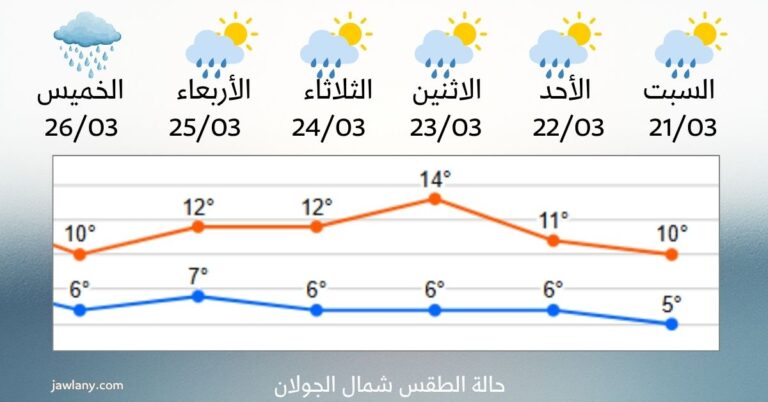 | الخميس | 26/03 | 10° | 6° | ماطر |