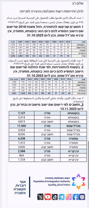 تفيد معطيات سلطة السكان والهجرة الإسرائيلية أن عدد الأشخاص، من أبناء الجولان، الذين تقدموا بطلب للحصول على الجنسية الإسرائيلية في العام 2025 قد بلغ 2,863 شخصاً، تمت الموافقة على 2,540 طلباً منها.