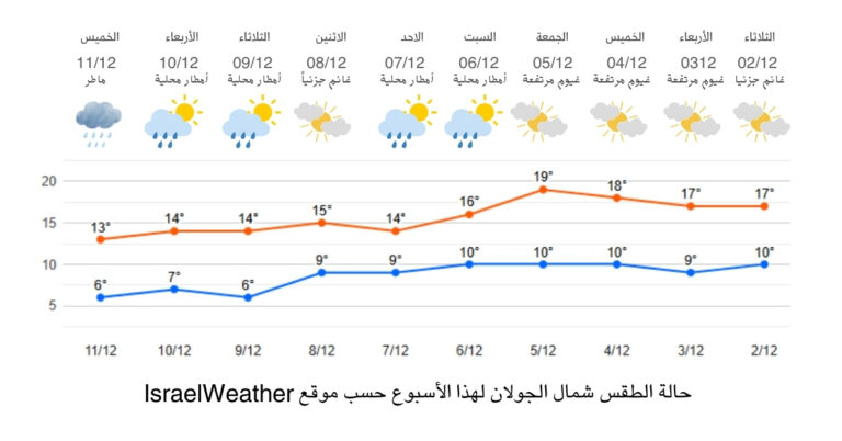 تشير معطيات موقع Israel Weather لهذا الأسبوع إلى استقرار حالة الطقس شمال الجولان مع درجات حرارة أعلى من المعدل لمثل هذا الوقت. غيوم مرتفعة وصحو حتى نهاية الأسبوع . الثلاثاء 2/12:تسجّل درجات الحرارة العظمى نحو…