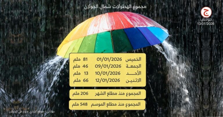 يفيد الراصد الجوي مرتضى الغوطاني، الذي يدير محطة رصد جوية خاصة في منزله في مجدل شمس، على ارتفاع 1,100 متر عن سطح البحر، بأن الليلة الماضية شهدت هطول 66 ملم من الأمطار، لترفع مجموع الهطولات…