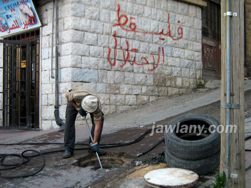 الشارع بعد إصلاح العطل وذلك بمساعدة خرطوم مياه ذي ضغط قوي.